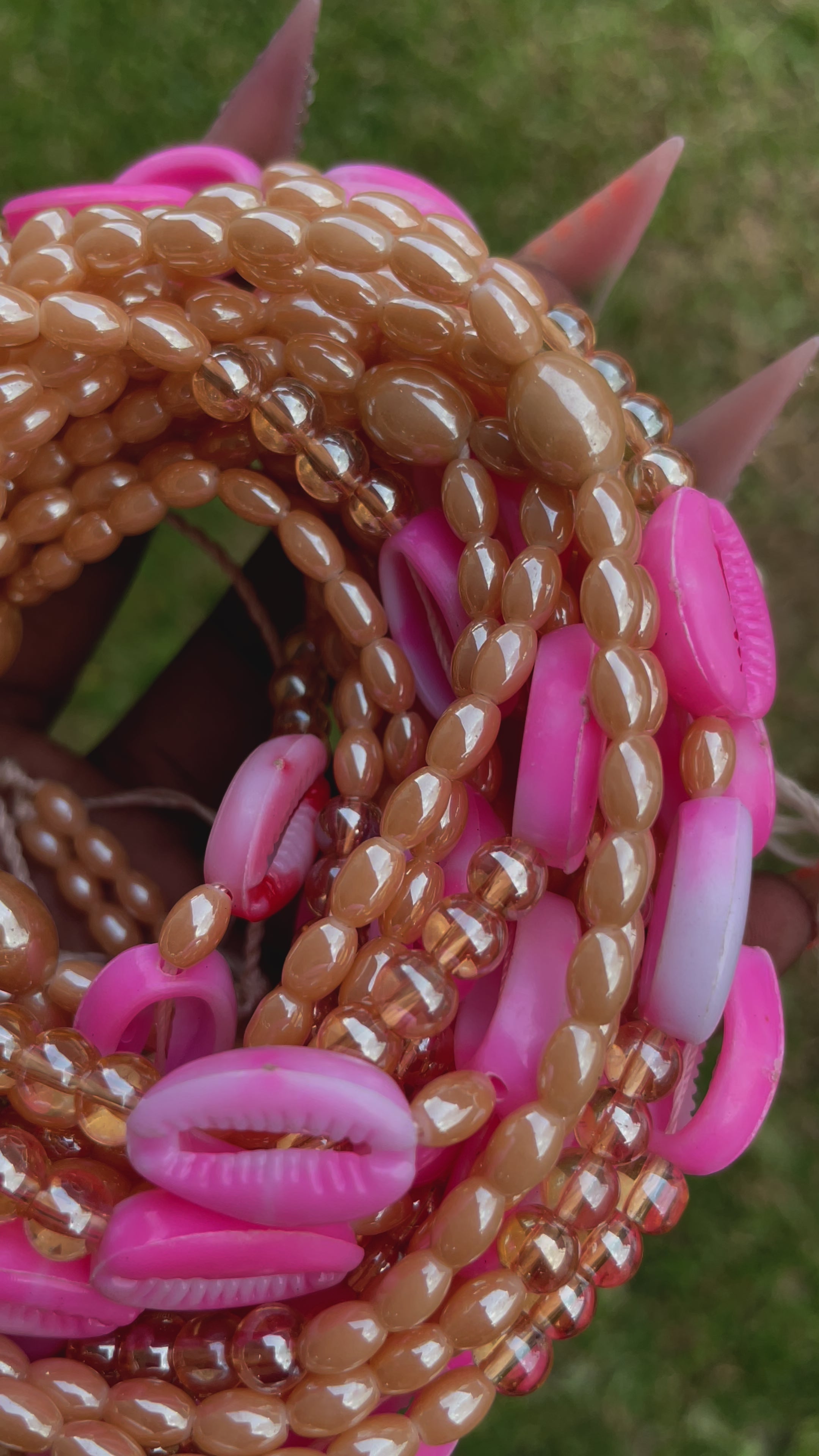 🐚 Pink Cowry Shell Accents - Cultural Charm: Interspersed among the brown beads are delicate pink cowry shell accents, infusing Boboniessoko with cultural charm. Cowry shells hold deep cultural significance, symbolizing beauty, femininity, and protection, adding an element of tradition and allure to the waist bead.