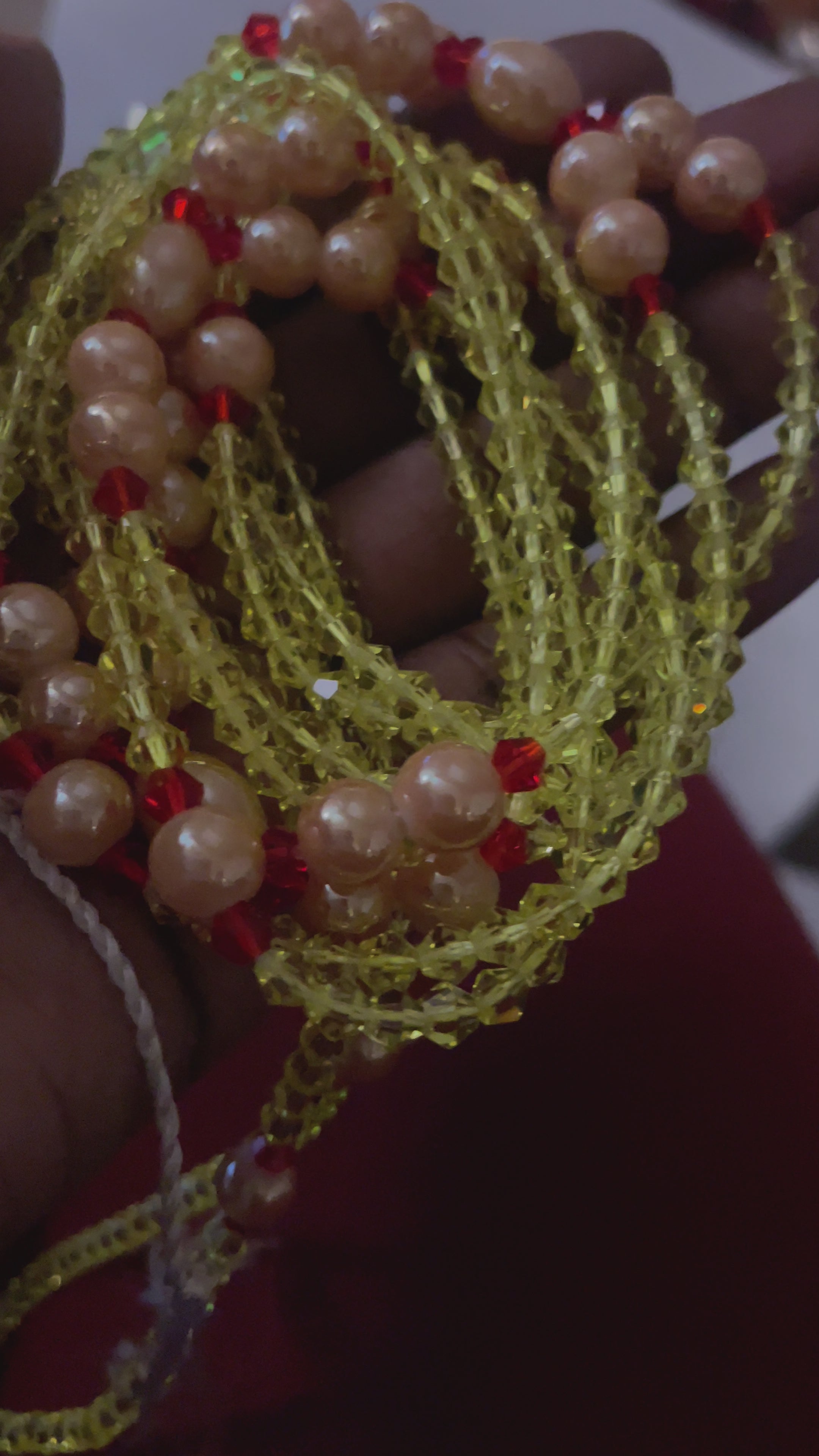Double Strand Waist Bead "Dagadji" – a radiant combination of bright yellow glass seed beads, gracefully adorned with the subtle warmth of light brown crystal seed bead accents and the fiery allure of red crystal seed bead accents. This meticulously handcrafted waist bead features a double-strand design, elevating your silhouette with a luminous and harmonious fusion of colors. Immerse yourself in the inviting brilliance and dynamic charm of this waist bead, crafted to make a statement and express your unique style.