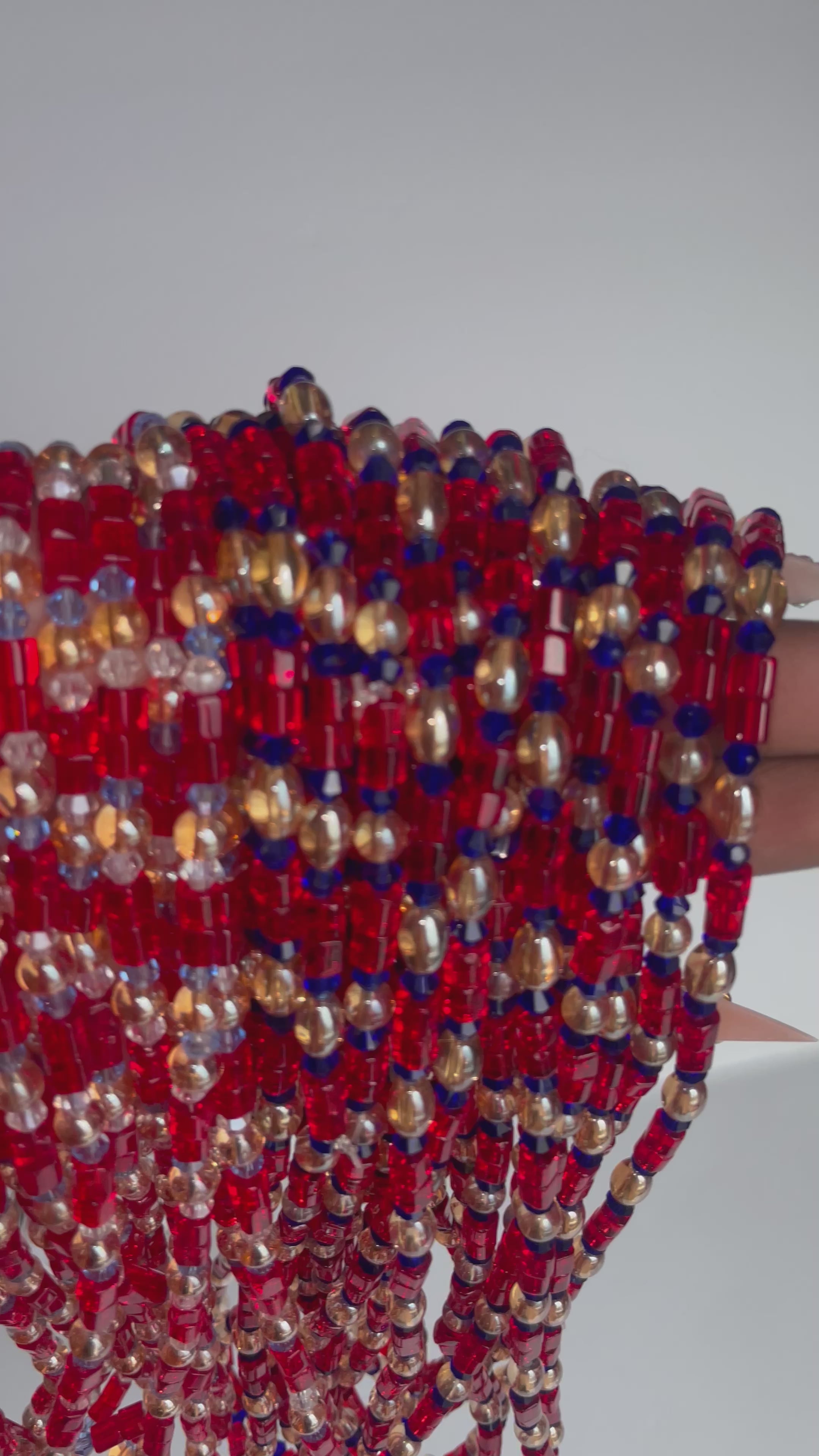 Elastic waist beads from the Ivory Coast! This stunning piece features vivid red crystal glass seed beads, symbolizing passion and vitality, accented by striking blue crystal glass beads that add a touch of tranquility and wisdom.