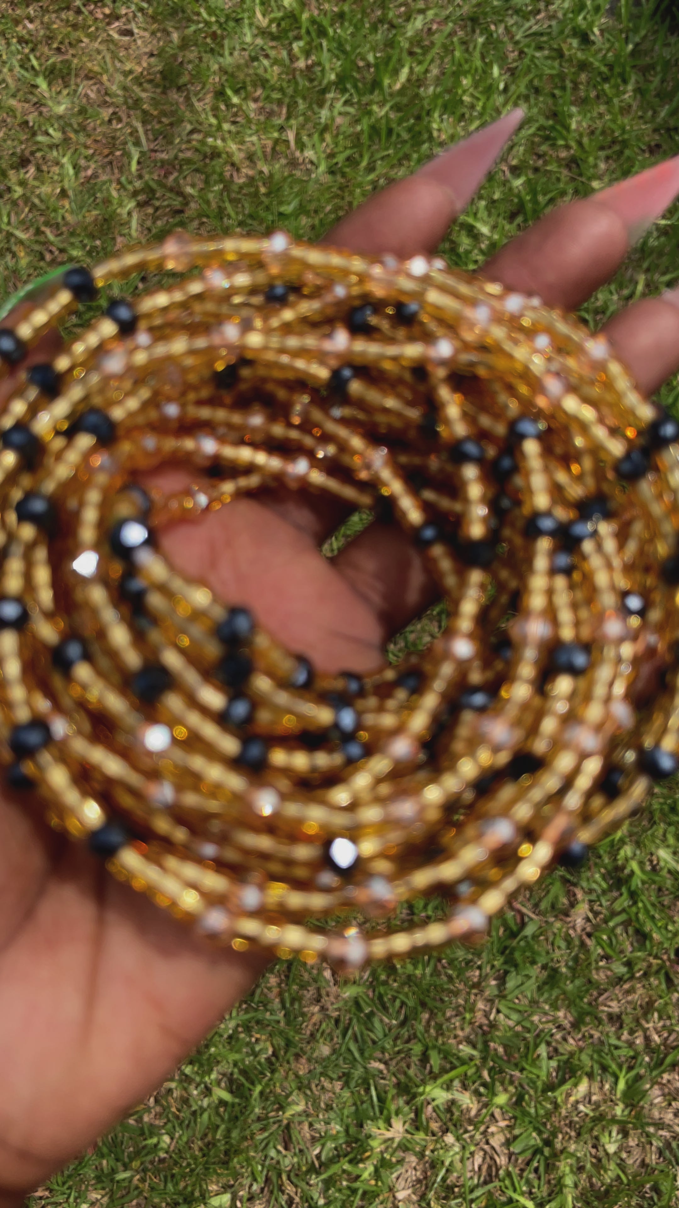 "Morofo," a single-strand waist bead that whispers elegance and exudes timeless sophistication. Handcrafted with meticulous care, this waist bead seamlessly blends classic black glass seed beads with the regal allure of gold crystal glass accents, creating a piece that resonates with both tradition and contemporary style.
