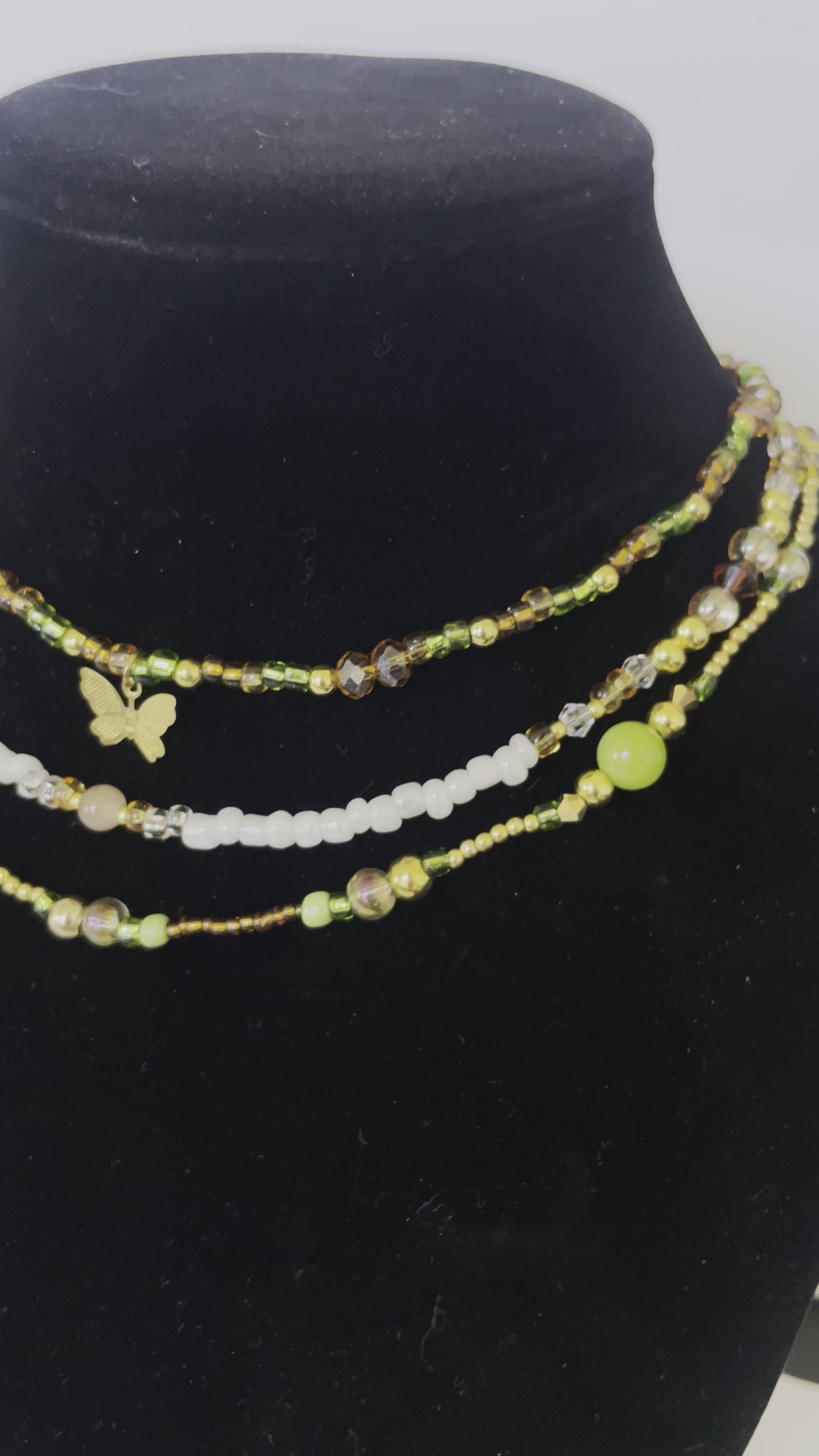 Earth Angel Necklaces feature a blend of green, gold, and brown glass beads, with a gold butterfly pendant. Each necklace is handmade with 14K gold plated beads and glass beads, adding style and durability to your look.