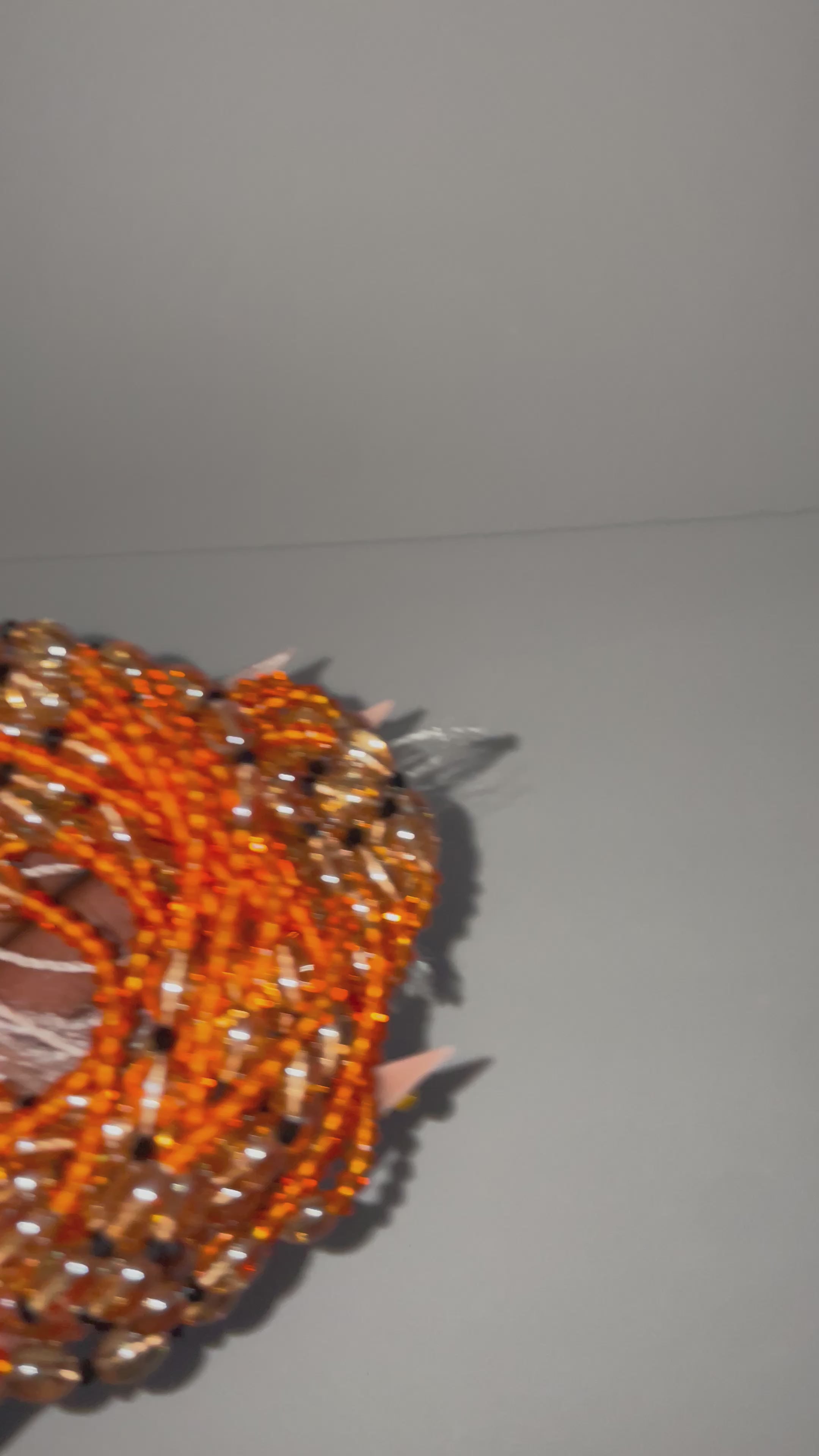 This exquisite piece features radiant orange crystal glass seed beads, symbolizing energy and enthusiasm, accented with warm sandy brown and sleek black crystal glass beads. Together, these colors create a striking blend of earthiness, stability, and sophistication.