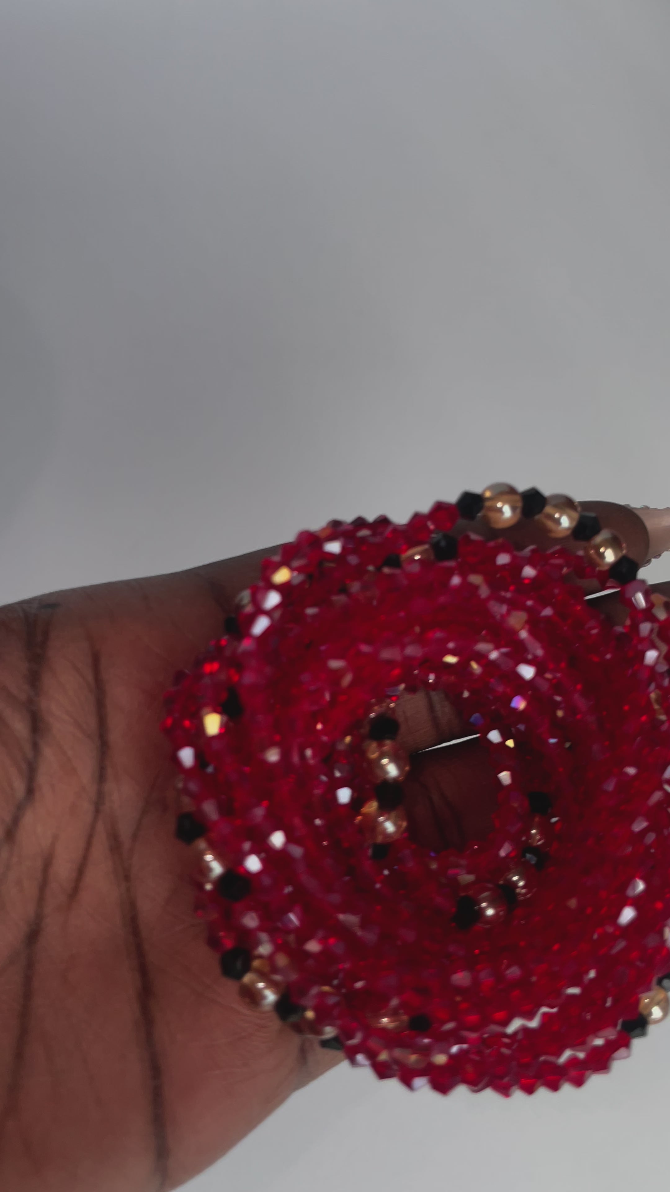 Elastic waist beads from the Ivory Coast:This stunning piece features vibrant red crystal glass seed beads, symbolizing passion and vitality, accented with sandy brown and black crystal glass beads for a touch of warmth, stability, and elegance.