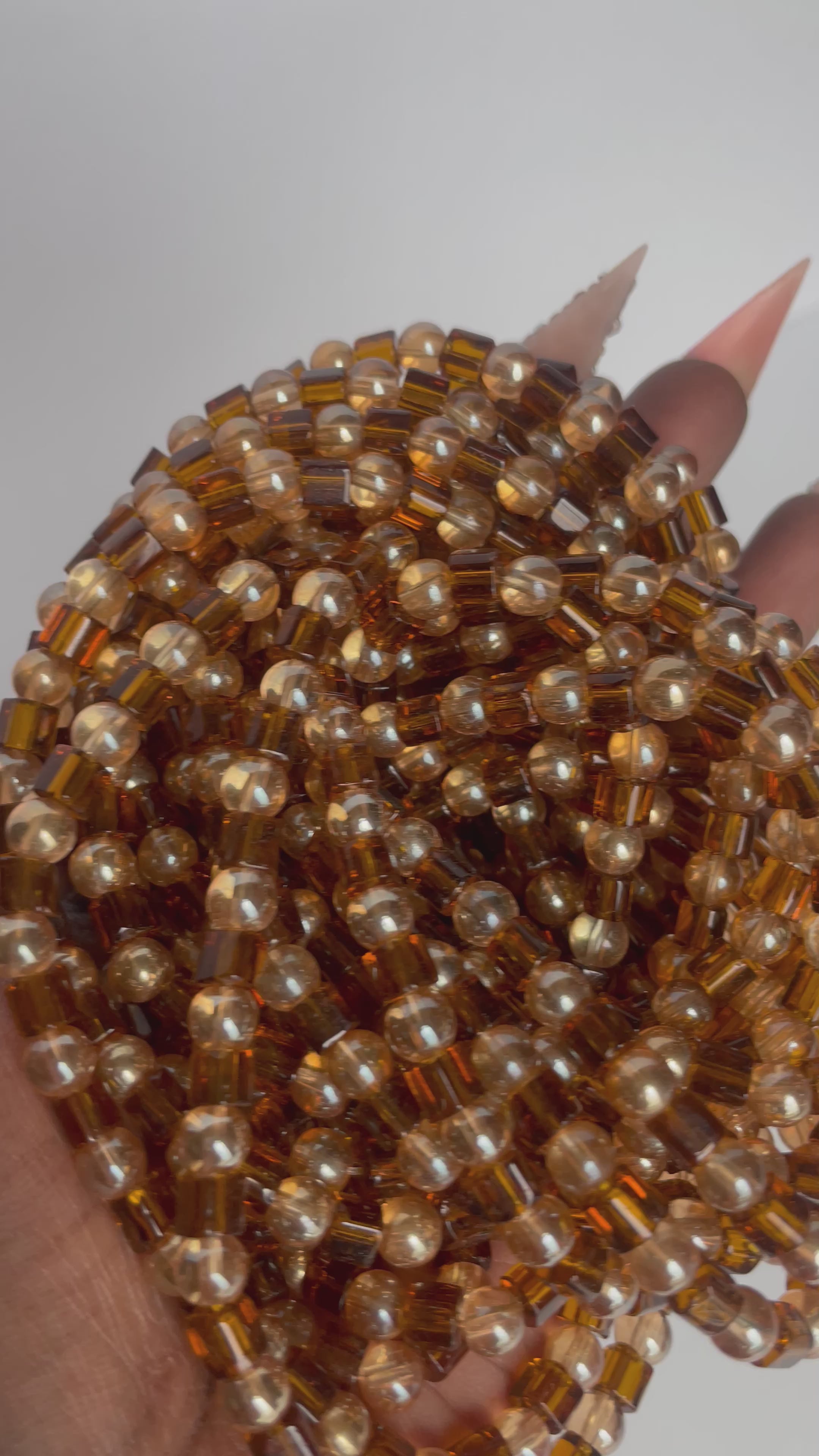 Elastic waist beads, handmade by skilled artisans in the Ivory Coast. This distinctive piece features brown square crystal glass seed beads paired with light brown round crystal glass seed beads, creating a harmonious blend of earthy tones that symbolize grounding and stability.