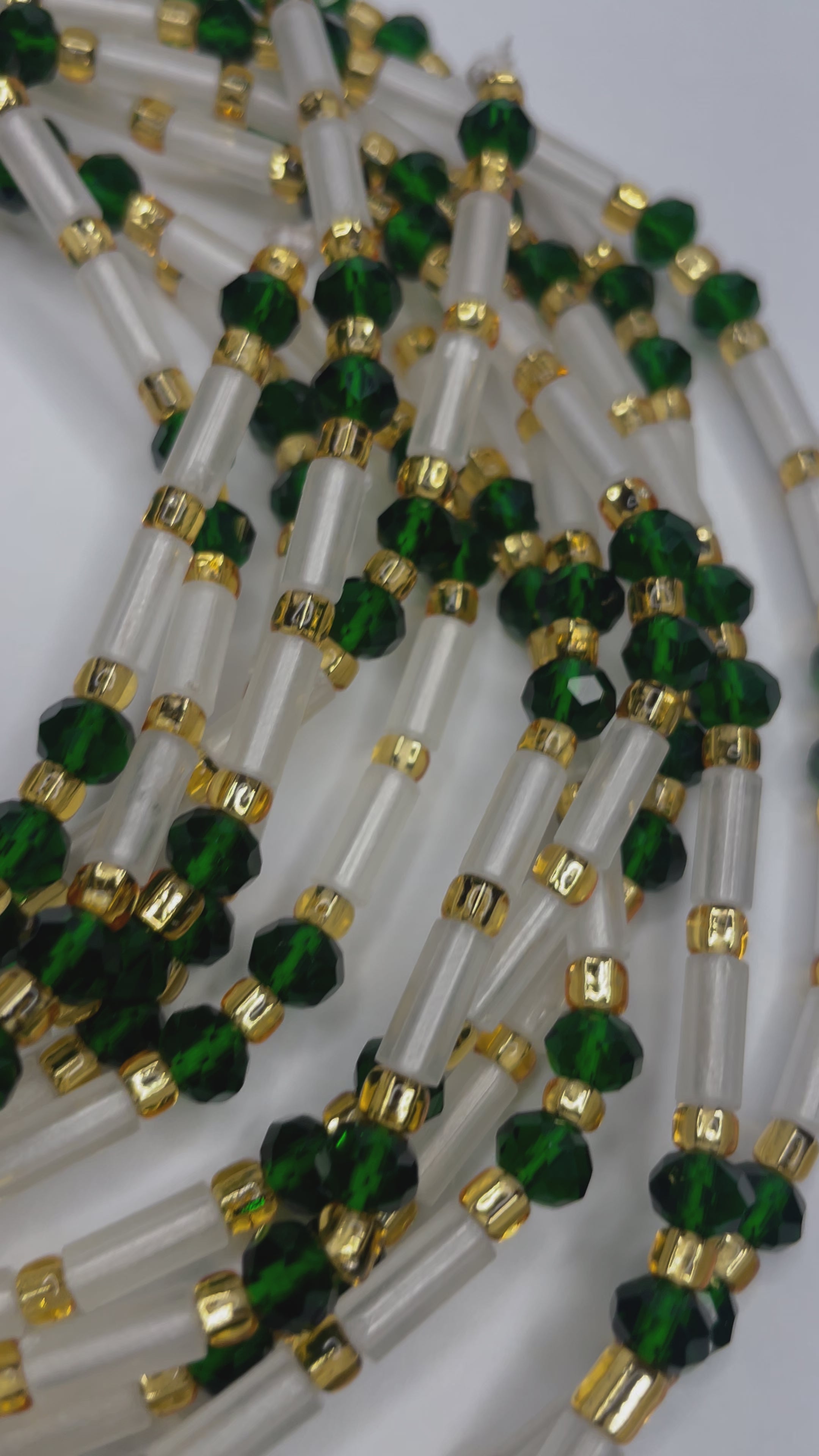 Single Strand Waist Bead Moussadougou – a mesmerizing accessory that seamlessly blends the ethereal allure of white glow-in-the-dark glass beads with the sophisticated accents of emerald green crystal glass seed beads and opulent gold glass seed beads.