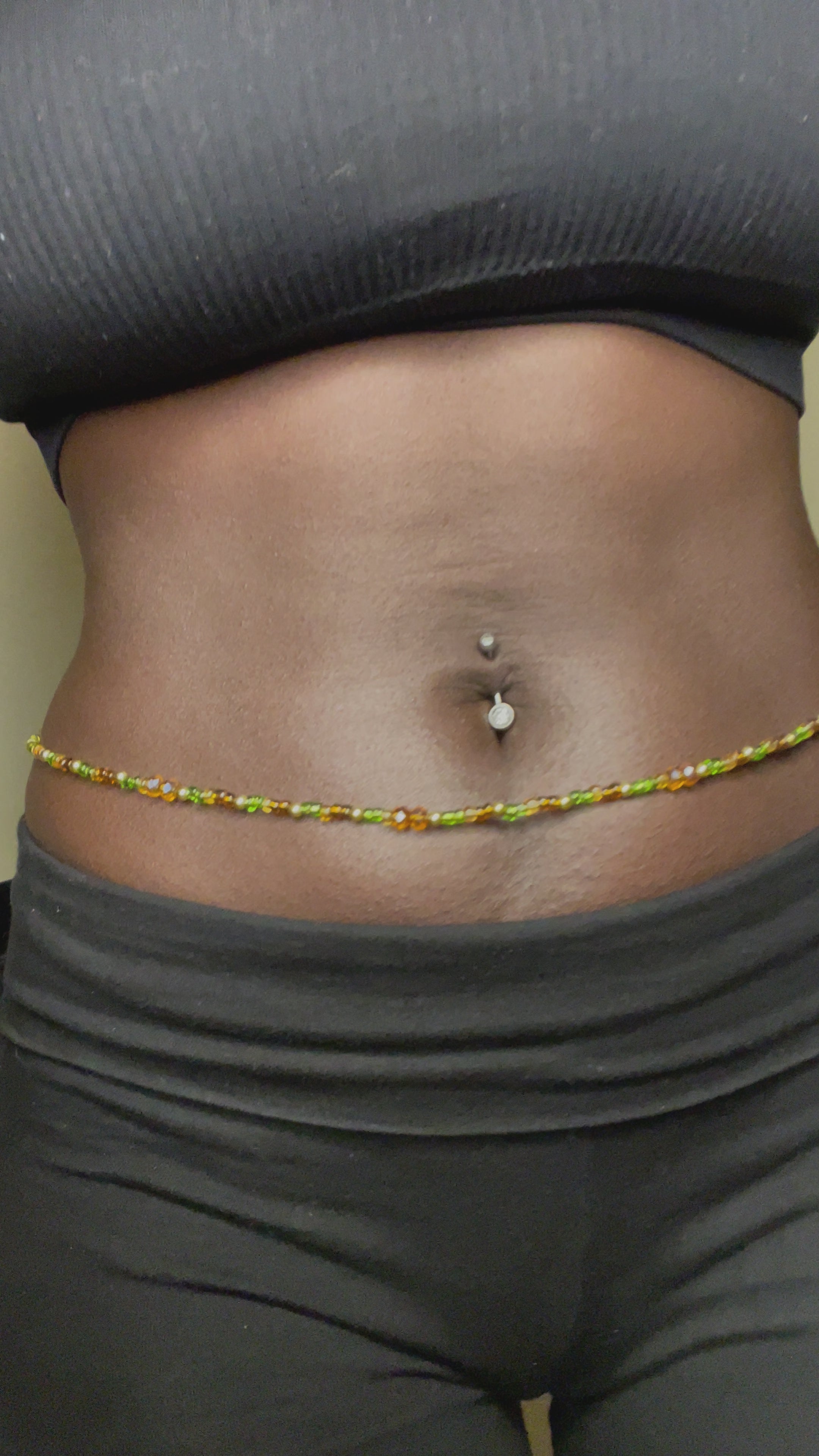Beaded Belly Chains are a fun mix between a waist bead and belly chain. This style is not threaded! It comes with a lobster clasp and 4inch extender chain so you can adjust it as you like. This chain features lush green and rich brown-colored glass seed beads, gracefully adorned with 18k gold-plated beads. Immerse yourself in the natural beauty and customizable comfort of this belly chain, designed to enhance your waistline with a touch of organic elegance.